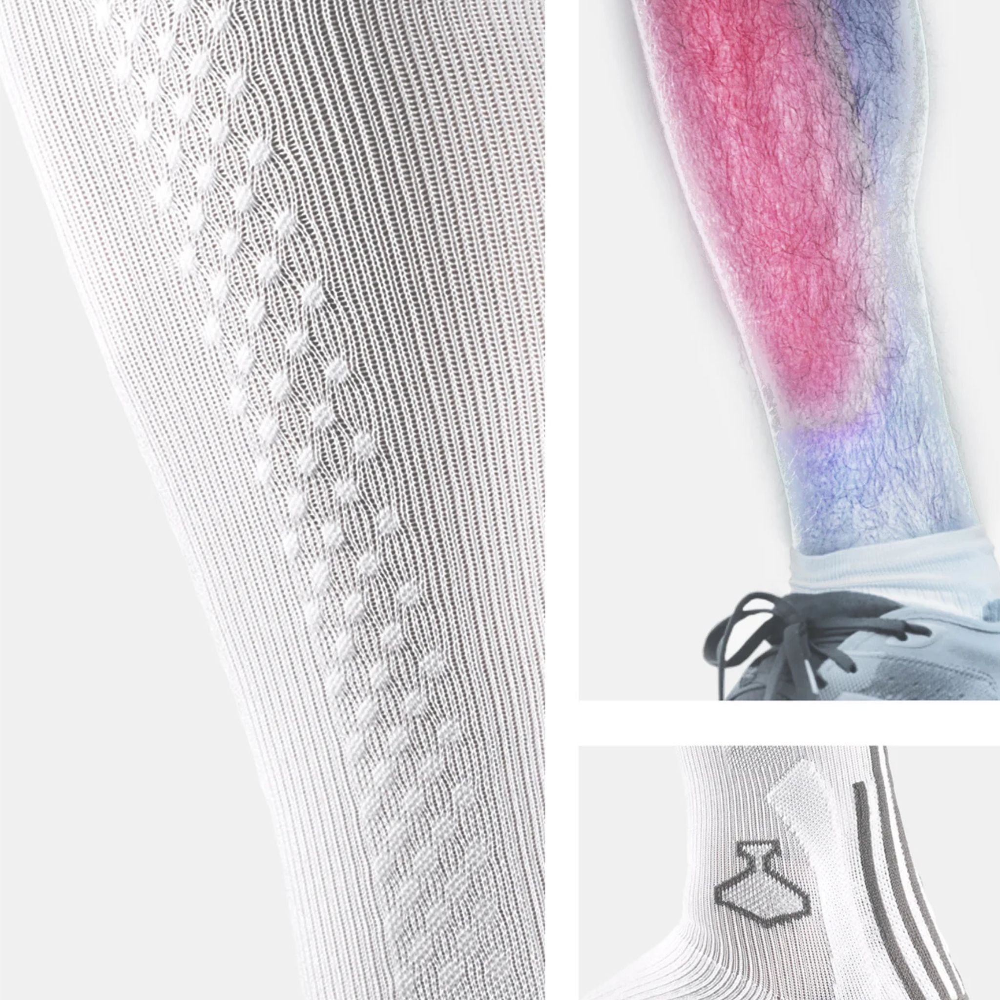 På bägge sidor av smalbenet, är strumpan försedd med en punktvis silikonbeläggning – strategiskt placerad på de områden där du upplever smärta om du lider av benhinneinflammation. Silikonet ska stimulera de muskler och senor som sitter nära smalbenet och därigenom lindra smärta i samband med löpaktivitet. Den smärta som upplevs med benhinneinflammation är oftast värst i landningsfasen under löpning, särskilt på hårda ytor.